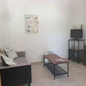 La pièce à vivre est aménagée avec un canapé, table basse, poste de télévision, une table et 2 chaises, un espace cuisine avec plaques, micro-onde, réfrigérateur/congélateur, et bien sûr cafetière (dosettes type Senseo), bouilloire, grille pain et vaisselle et ustensiles de base.