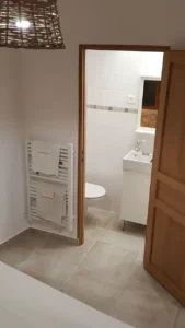 La Meulière est constituée de 3 pièces : à l’étage, une chambre avec un lit queensize et une chambre de 2 lits d’une place. Les chambres donnent accès à un pallier qui dessert la salle d’eau : WC, lavabo, douche.