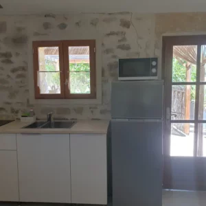 Le gîte la Maisonnée est un logement indépendant constituant jadis les appartements historiques du « Patron » du Mas. La cuisine équipée constitue la première pièce. Une chambre parentale avec son espace douche et lavabo privatif donne sur la cour intérieure du Mas. Un WC indépendant, une salle d’eau – douche à l’italienne, lavabo. Une grande pièce à vivre avec une grande table de ferme, un canapé convertible, un poêle à bois. Une 2ème chambre avec 2 lits 1 place donne sur la terrasse intérieure.