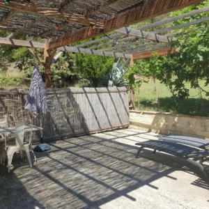 Devant la porte une pergola privative avec table et chaises, transat/lit de repos donne sur le parvis du Mas et dessert l’espace piscine, le jeu de boule et les équipement communs…